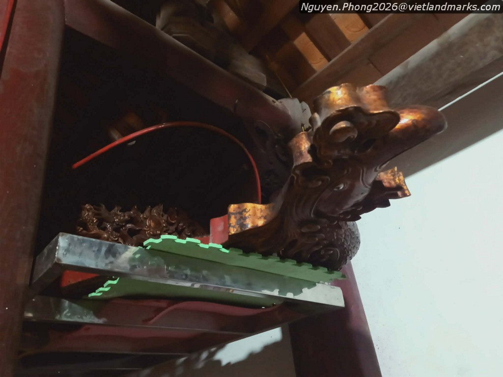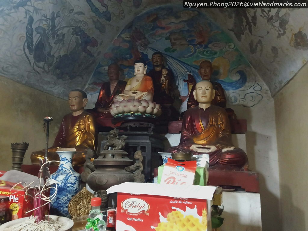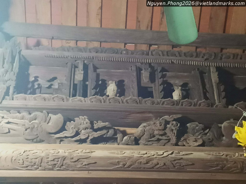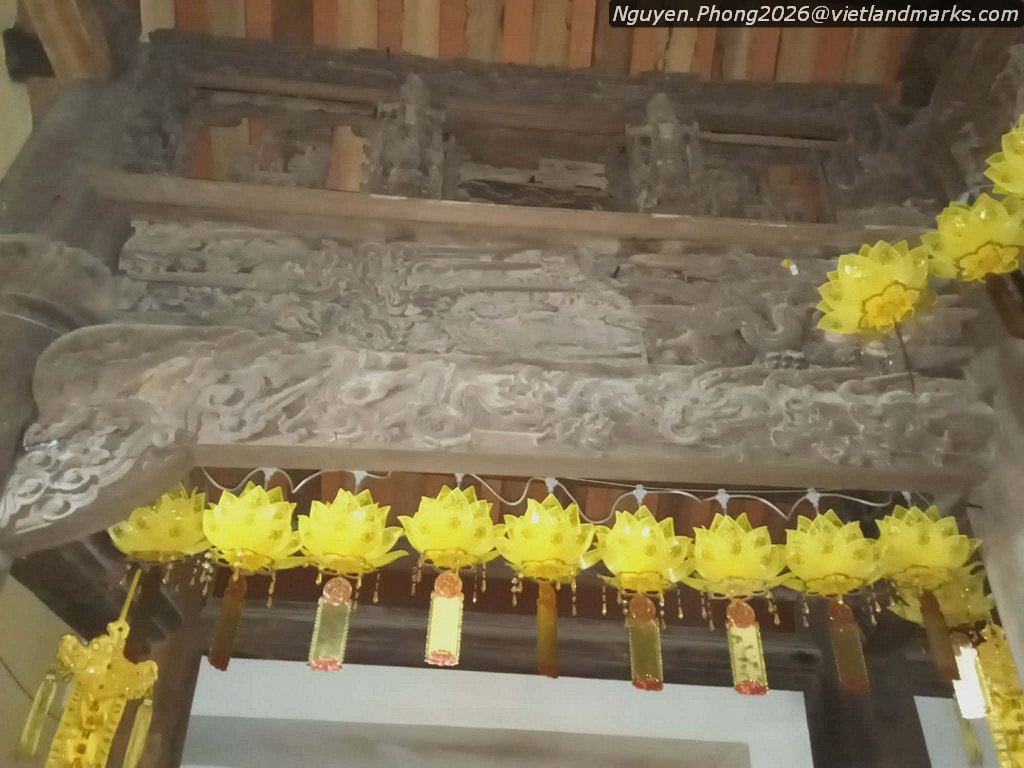 Tam bảo chùa gồm có 8 gian xây dọc. Tất cả 8 bộ vì tại đây đều được làm bằng gỗ lim theo kết cấu chồng rường giá chiêng. Gánh đỡ mỗi bộ vì là 4 cây cột gỗ lim, cột cái có đường kính 0,45 m, cột quân có đường kính 0,40 m. Các cây cột đều được đặt trên chân tảng đá cổ bồng cao 0,40 m. Toàn bộ các cấu kiện gỗ ở đây như câu đầu, xà đai, con rường, đố lụa đều được chạm khắc các đề tài tứ linh, hổ phù, hoa sen, lưỡng long chầu nguyệt... với lá hỏa giật cấp mang phong cách nghệ thuật thời Hậu Lê, thế kỷ XVII - XVIII. Kỹ thuật chạm cũng đa dạng như kênh bong nổi khối, thông phong. Nét chạm sâu, chi tiết, tinh tế.