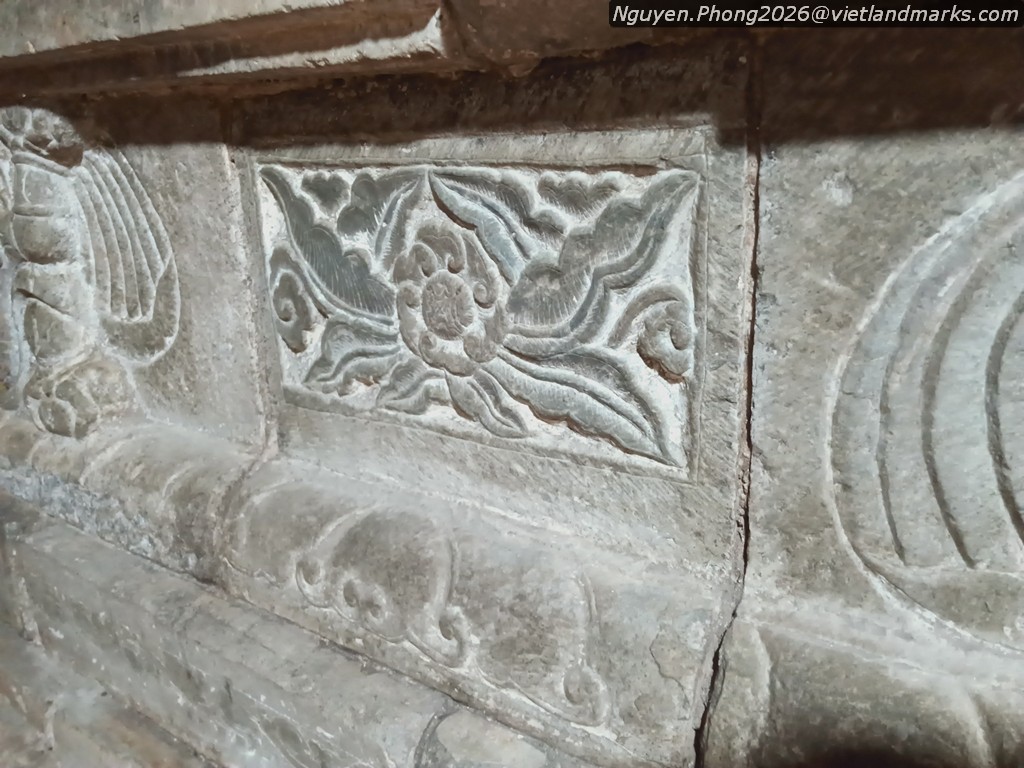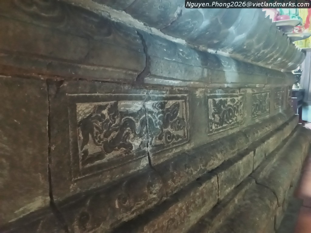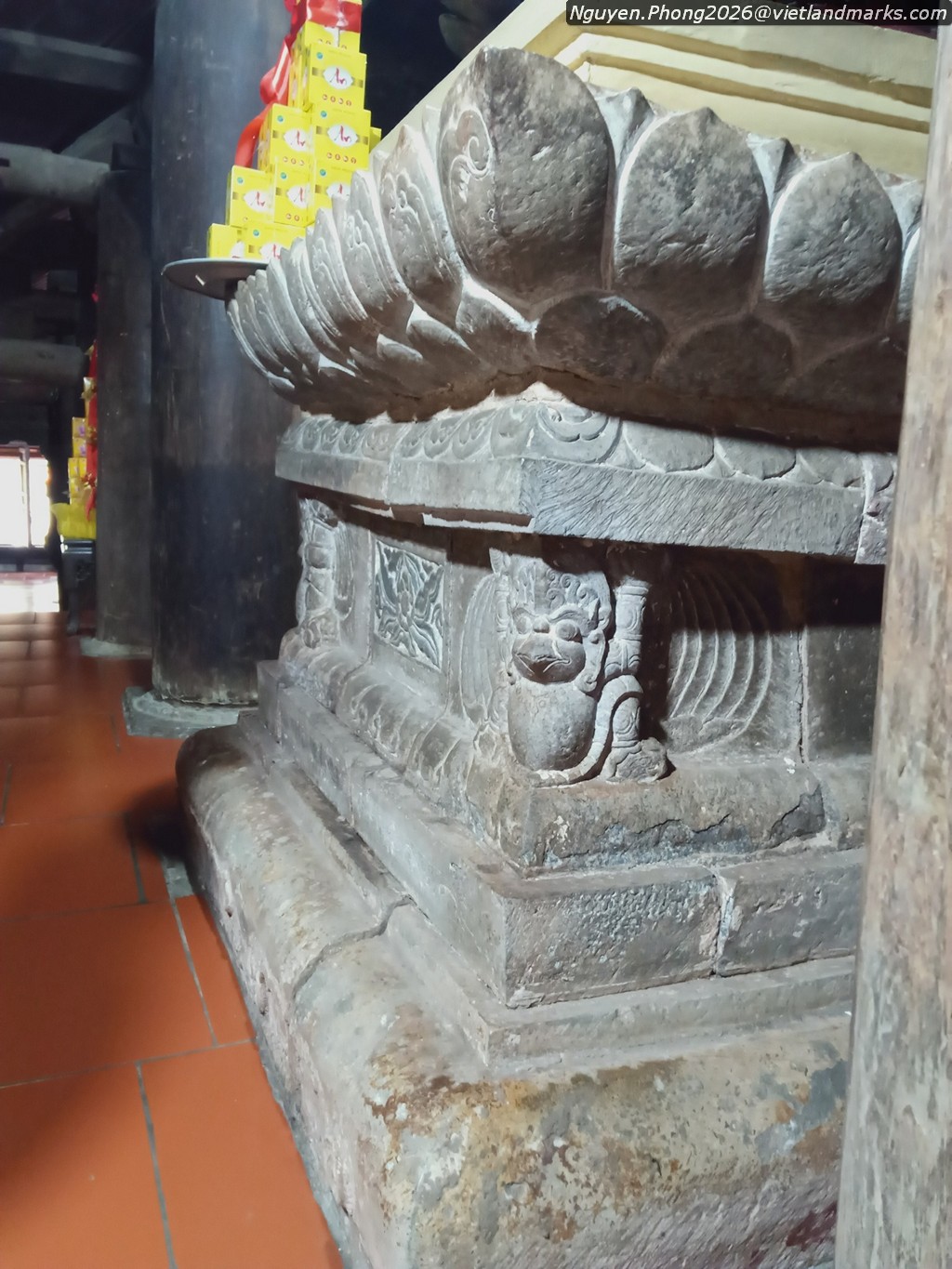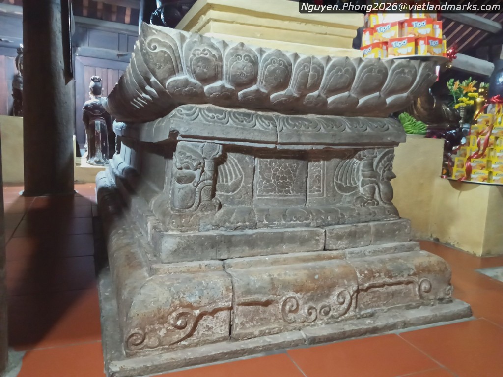 Đặc biệt ở chùa Hương Trai có chiếc bệ đá hoa sen khối hộp thuộc loại di vật đặc trưng của nghệ thuật cuối thời Trần. Bệ có kích thước rất lớn: cao 160cm, mặt rộng 132cm và dài 366cm, hiện đặt ba pho Tam Thế còn rộng, phần trên là tòa sen cánh mập mạp trang trí một cánh sen cuộn với đầu hoa mặt nhẫn ở giữa, phần thân có chim thần (garuda) ở góc, mặt trước chạm 4 ô rồng uốn lượn. Bệ đá còn có nhiều hoa văn đặc thù của thời Trần, công năng là bàn Phật, ghi việc cúng ruộng tiền cho chùa năm Đại Trị 3 (1370) và niên đại tạo dựng bệ đá vào năm Đại Định 2 (1370).