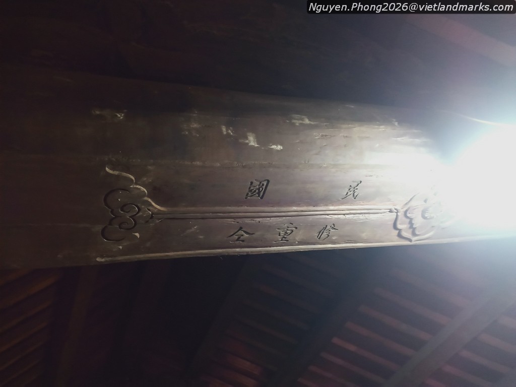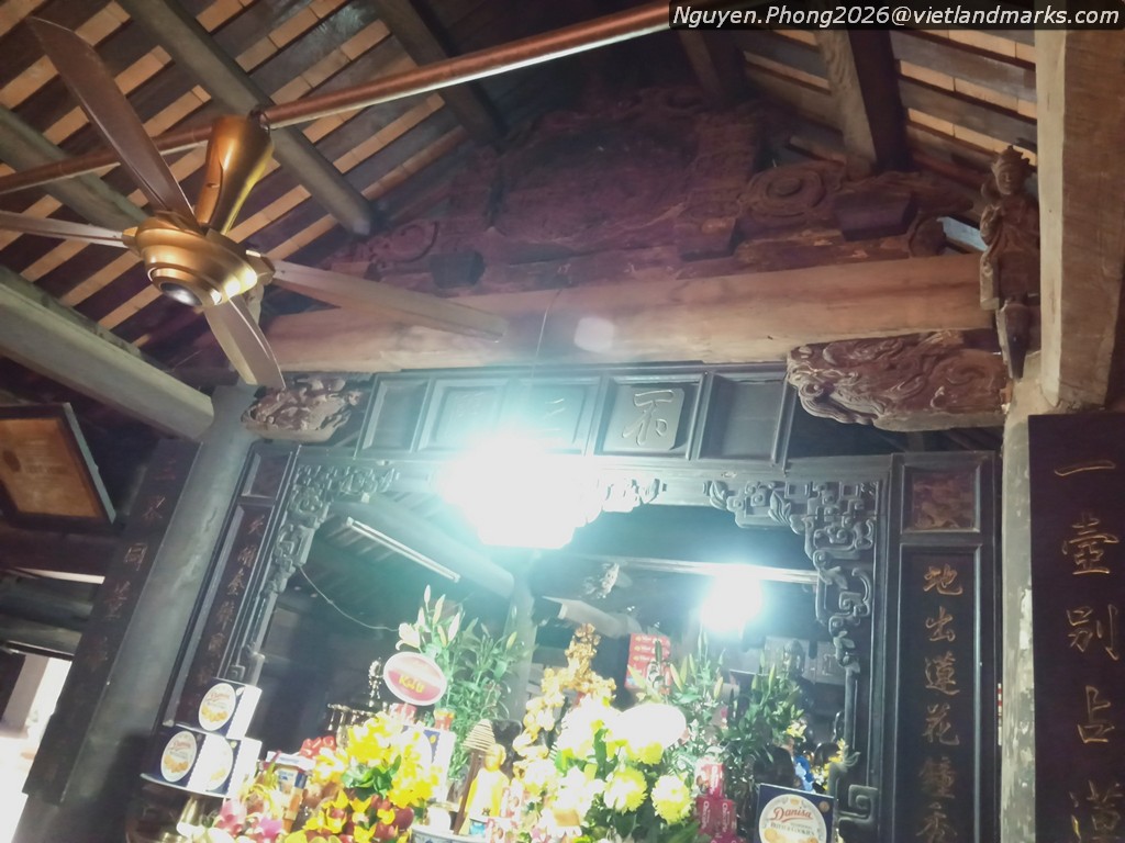 Chùa hướng Tây - Tây Bắc, là hướng thông thường của nhiều chùa nhìn về đức Phật, Ngay sát chân đê là tòa Tam quan kiêm gác chuông, hai tầng đều 4 mái tỏa ra xung quanh với 8 đầu đao phong phú vui mắt, dàn ra 3 gian như một tòa nhà chồng diêm gần gũi chùa Tây Phương (Thạch Thất) thuộc Tây Sơn, sớm hơn kiểu chồng diêm tường hồi bít đốc thuộc thời Nguyễn muộn, ở bụng câu đầu trái có hàng chữ Hán viết mực bị cạo nát hai chữ đầu. “x Giáp Thân quý đông trùng tu” có thể gắn với việc sửa chữa tháng chạp năm Giáp Thân gần đây (1944), như thế hai chữ bị cạo có thể là niên hiệu “Bảo Đại”. Tầng dưới Tam quan đã xây tường bít chỉ để gian giữa lắp cánh cửa phần trên là gác chuông, ở gian giữa treo quả chuông “Hương Trai tự chung” cao 123cm đúc năm Gia Long 13 tức 1814 vua Gia Long có lệnh cấm nhân dân miền Bắc không được đúc chuông và xây chùa. Gian bên phải treo chiếc khánh có tên ở hai mặt là “Hương Trai tự khánh - Quý Dậu niên trùng tu”.