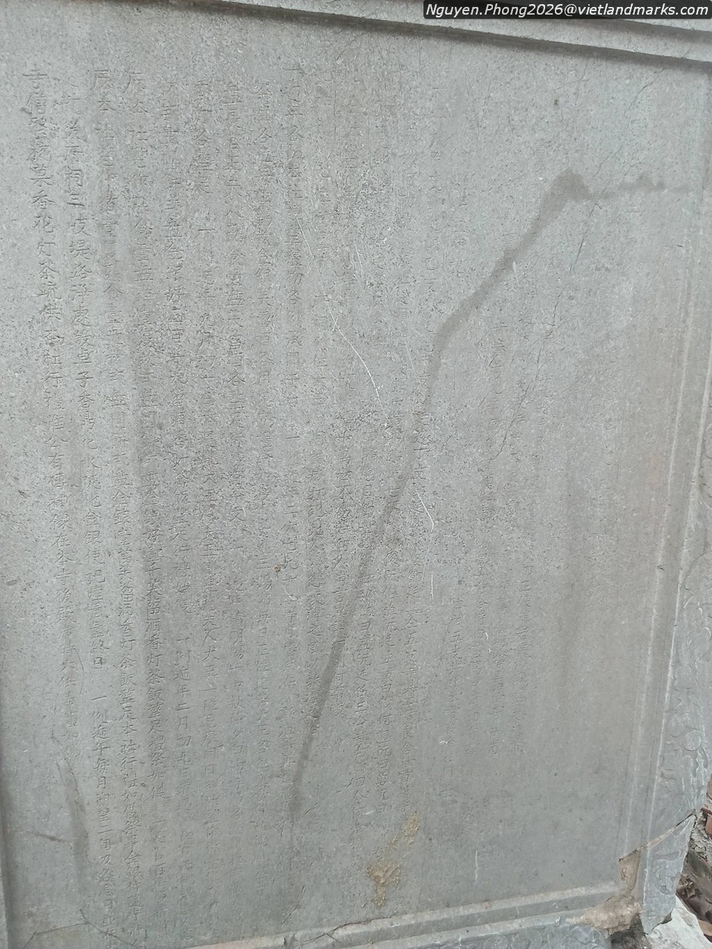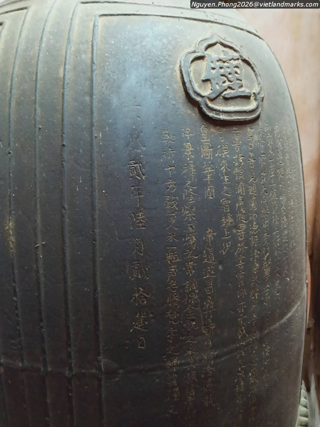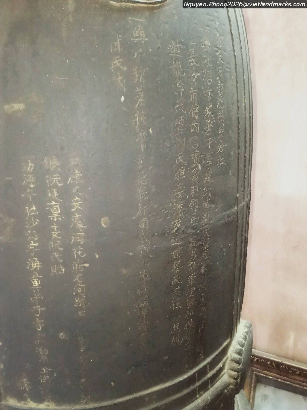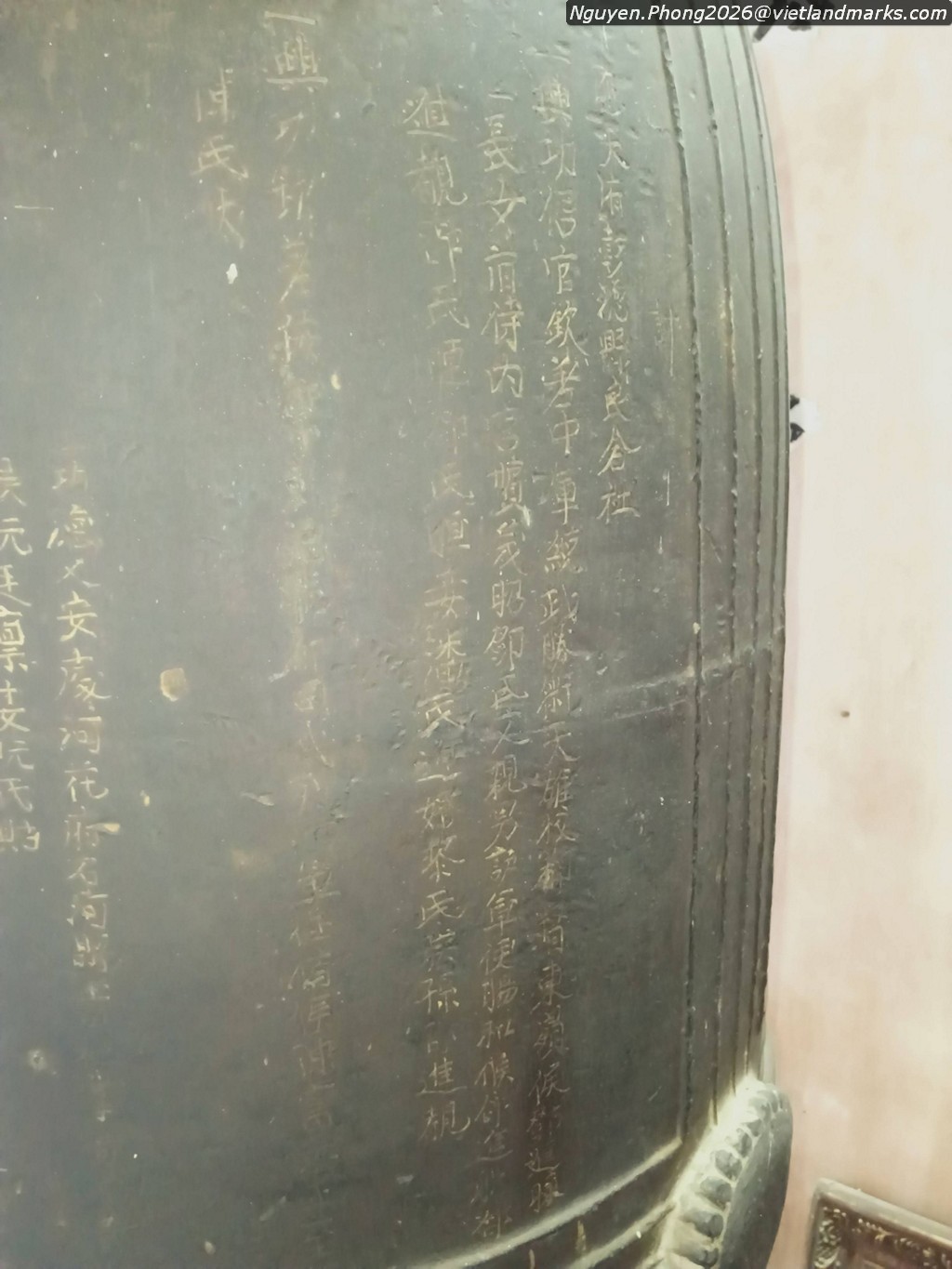 Trước cửa chùa khi xưa là gác chuông, hai tầng tám mái, bên dưới dựng 13 tấm bia. Nay gác chuông đã đổ nát, các tấm bia phơi nắng dầm mưa. Những tấm bia cổ được dựng trải dài từ thời Lê Trung Hưng, Tây Sơn đến thời Nguyễn. Tấm bia xưa nhất dựng năm Vĩnh Hựu thứ 3 (1737), ghi công đức của Quận phu nhân Đặng Thị Ngọc Thọ, bà là con gái của Yên quận công Đặng Tiến Thự với Thái trưởng quận thượng chúa Trịnh Thị Ngọc Thuyên. Tấm bia muộn nhất dựng năm Gia Long thứ 5, triều Nguyễn (1806) đặc biệt lưu danh nhiều vị Công Tính Chính Chi Nguyễn Hựu là con cháu của chúa Tiên Nguyễn Hoàng.