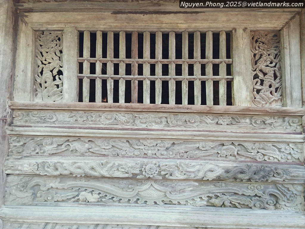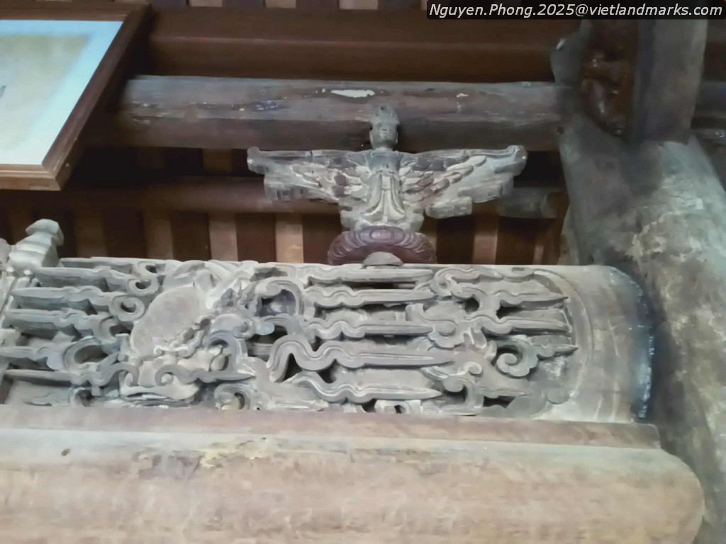 Hiện nay nhà Tiền đường gồm 3 gian 4 mái uốn cong, lợp ngói mũi hài, có kích thước: dài 9,3m; rộng 6,3m; kiến trúc gỗ gồm 4 cột cái, 2 cột quân ở hai vì kèo giữa. Ở hai trụ chính gian giữa chạm hình 2 tiên nữ có cánh như đang bay lên. Giữa hai trụ là bức chạm vân hóa long chầu mặt nguyệt; hình ảnh long, ly, quy, phượng và còn rất nhiều mảng hoa văn đẹp khác trong chùa, đáng chú ý là bức cửa võng được chạm khắc chủ đạo trong nhà Tiền đường làm nền cho phật điện với lối chạm bong đôi rồng được uốn thành 3 khúc đầu ngẩng lên chầu đỡ viên ngọc quí, những tia sáng tỏa ra xung quanh. Hai bên tả và hữu của nhà tiền đường còn có các bức chạm khắc độc đáo khắc nổi 5 chữ Hán “Xuân thời lạc Cảnh Thịnh” nghĩa là “Mùa xuân cảnh vui đẹp” cũng có thể người xưa muốn ghi khắc niên hiệu tạo nên tác phẩm nghệ thuật “Vui mùa xuân năm Cảnh Thịnh” từ năm (1793- 1802).