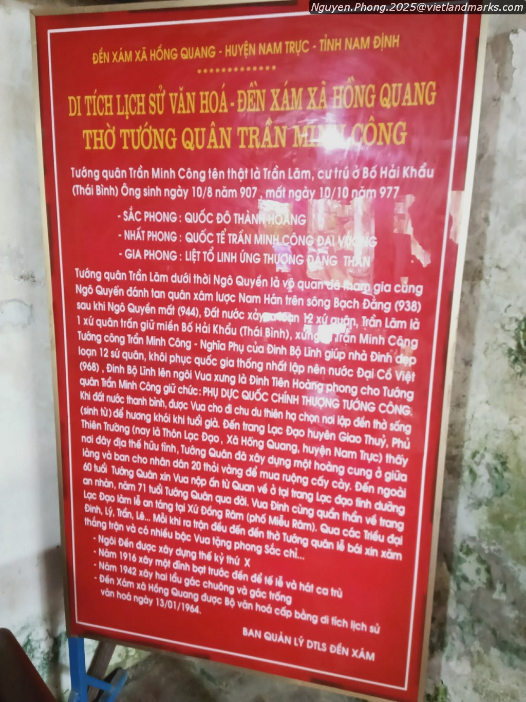 Sứ quân Trần Lãm tự Minh Công, vốn người quê gốc Quảng Đông, đến thời Ngô vương thì gia đình về sinh sống tại Giao Châu, làm nghề đánh cá ở Bố Hải Khẩu. Sau khi lên ngôi vua, Đinh Tiên Hoàng đã phong cho Trần Lãm chức Phụ dực Quốc chính Thượng tướng quân, lấy làng Xám - Lạc Đạo, huyện Giao Thủy làm ấp phong và dựng sinh từ. Sau khi thánh hoá lại gia phong mỹ tự "Quốc đô Thành hoàng", sắc cho dân xã phụng thờ.