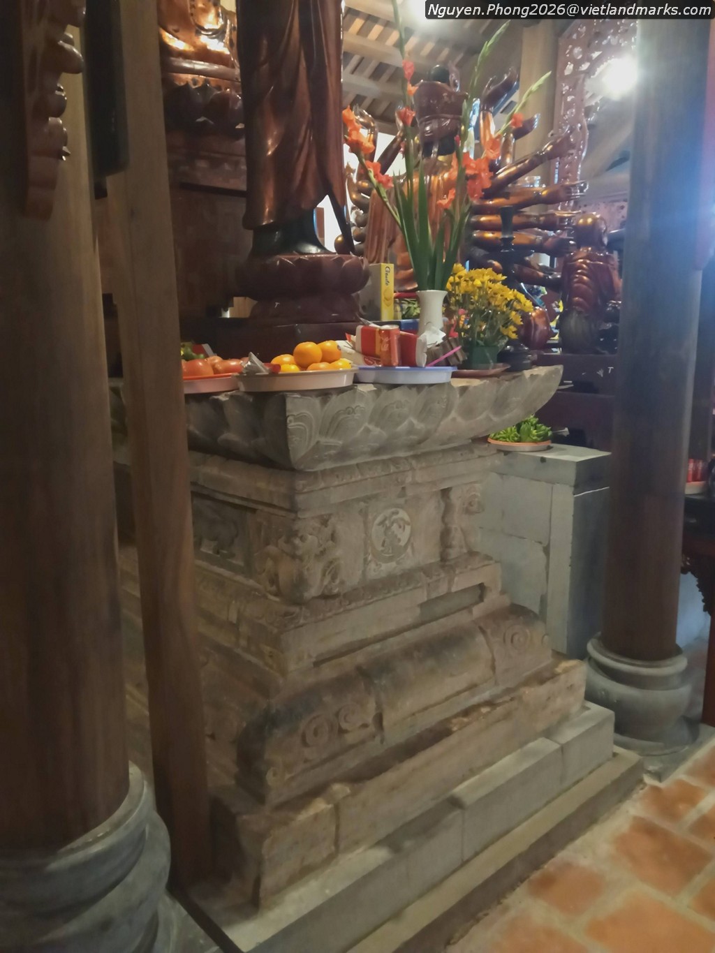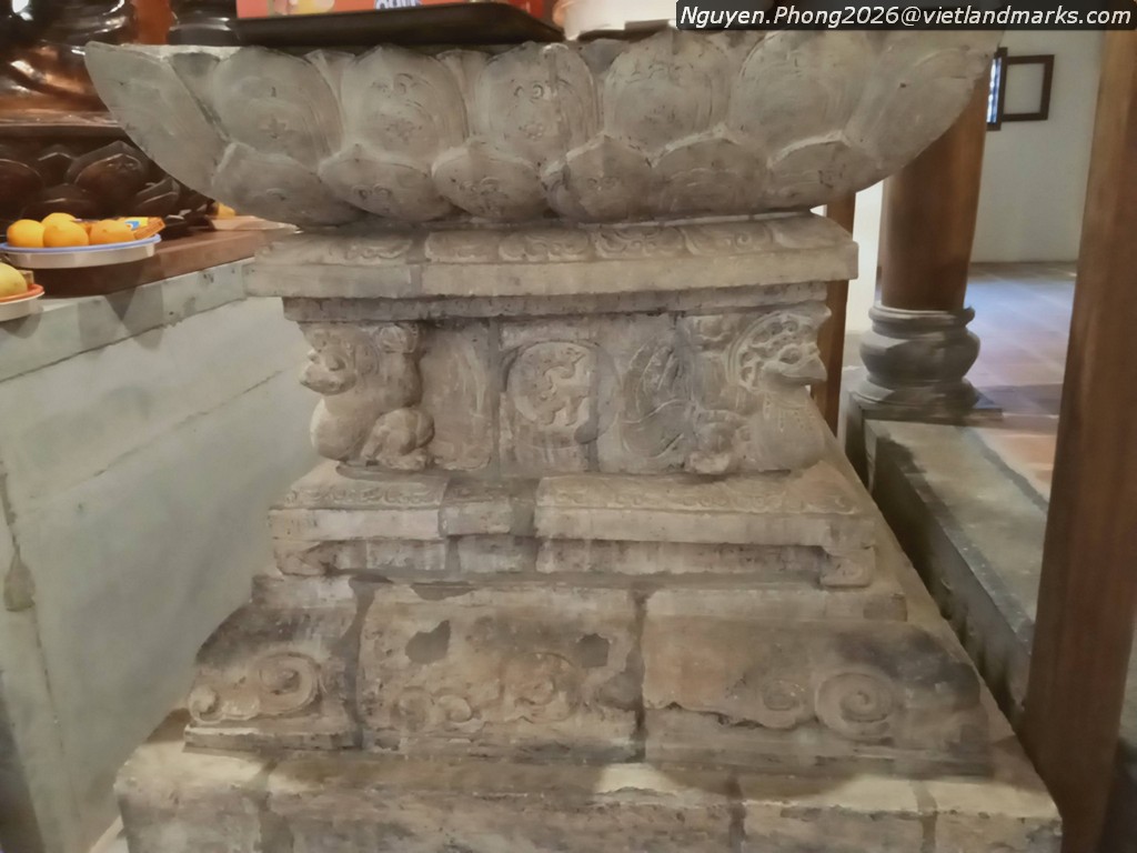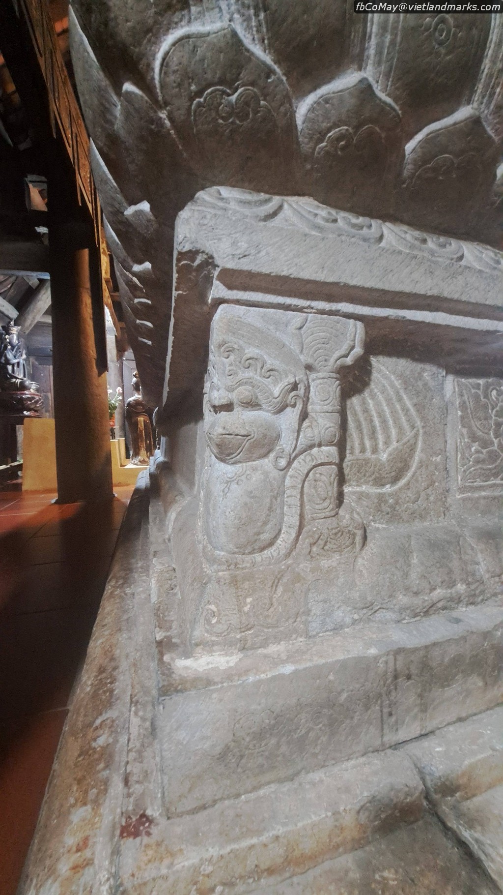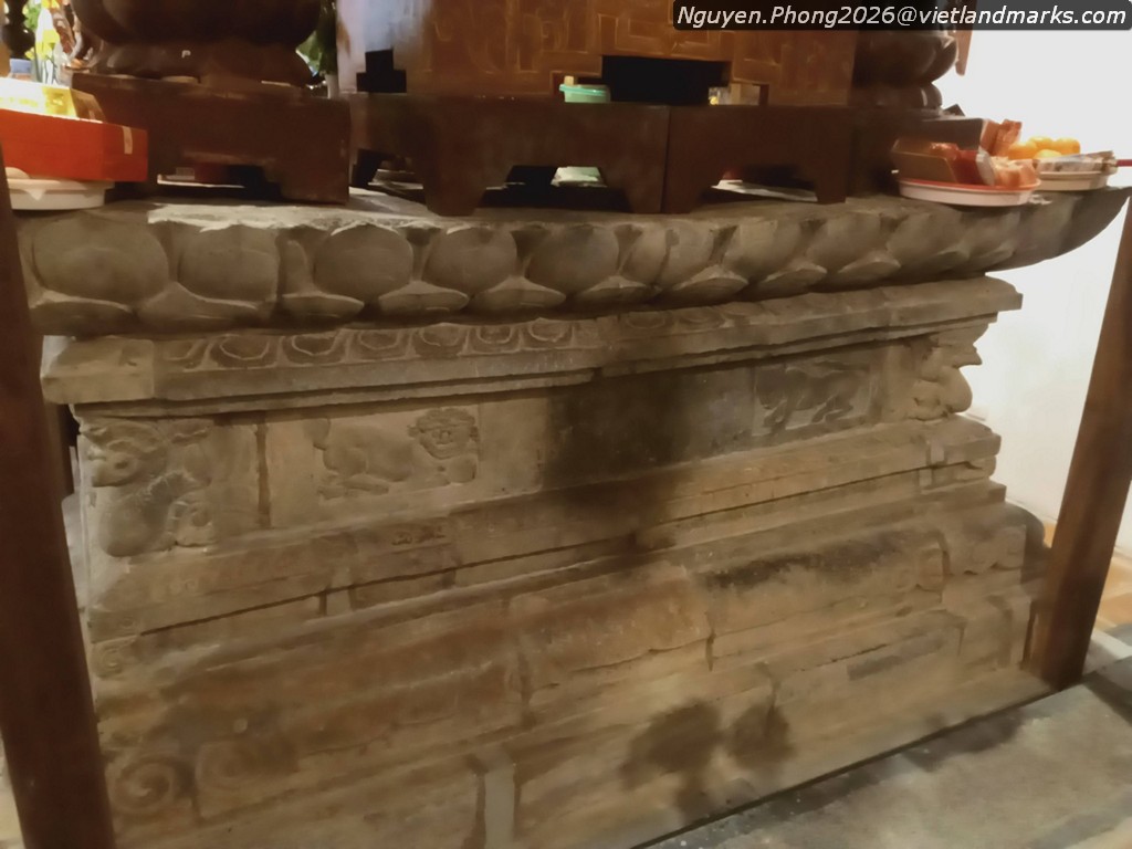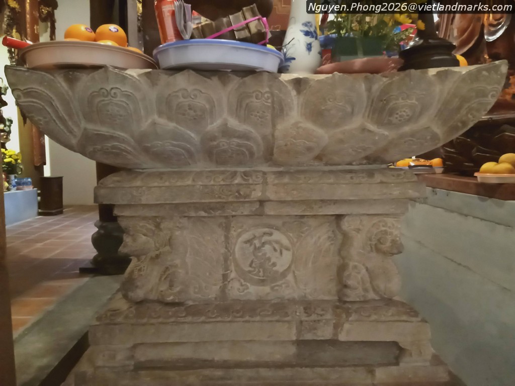 Ấn tượng nhất khi đến thăm chùa là bệ thờ bằng đá, tạc hình cánh sen, có khắc minh văn xác định thời gian tạo tác vào năm Long Khánh thứ 2 (1374), thời Trần. Bệ đá đã được công nhận là bảo vật quốc gia, lễ đón nhận quyết định được tổ chức trọng thể vào ngày 17/4/2026 cùng dịp với bệ đá chùa Hương Trai của làng Sấu - Dương Liễu cùng xã.