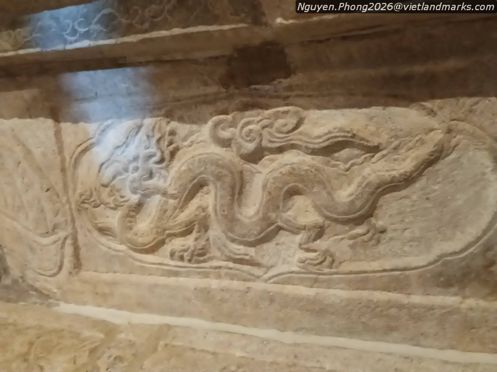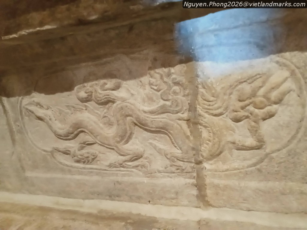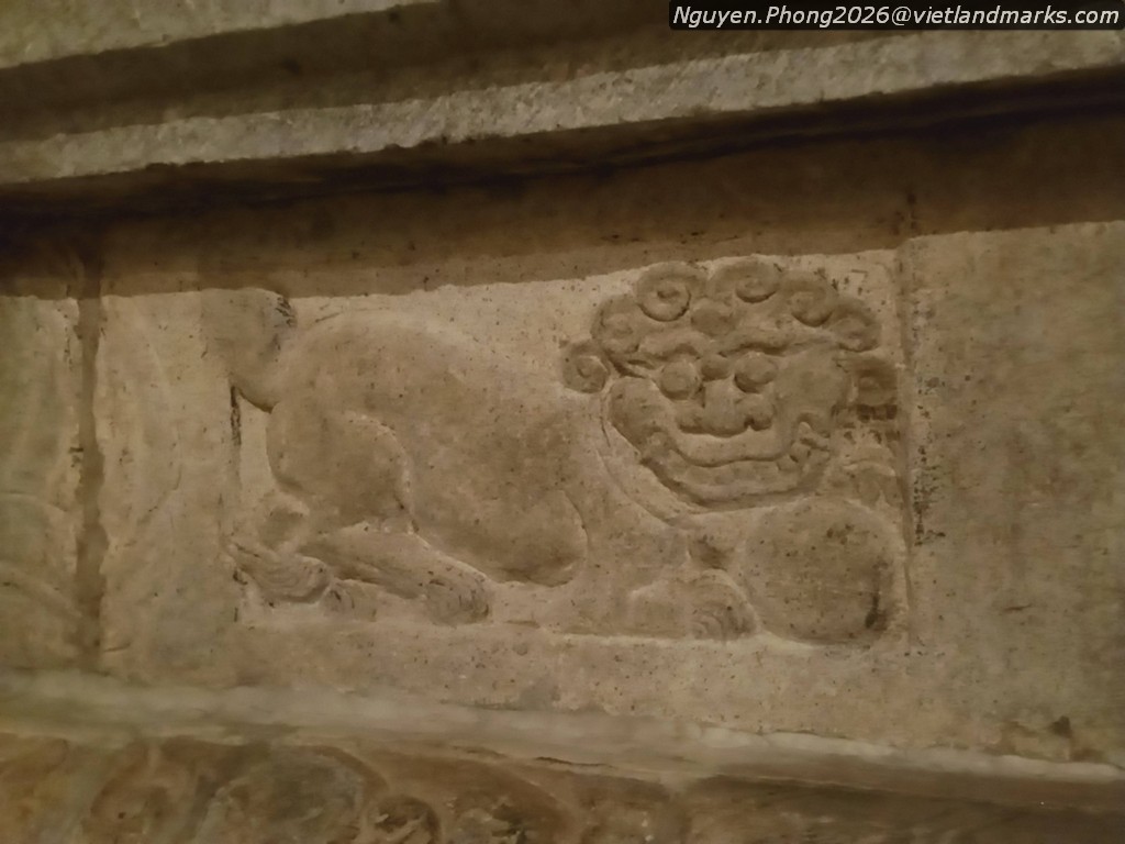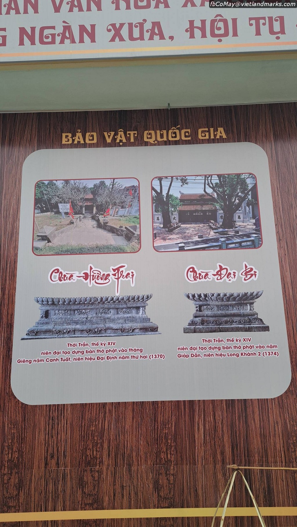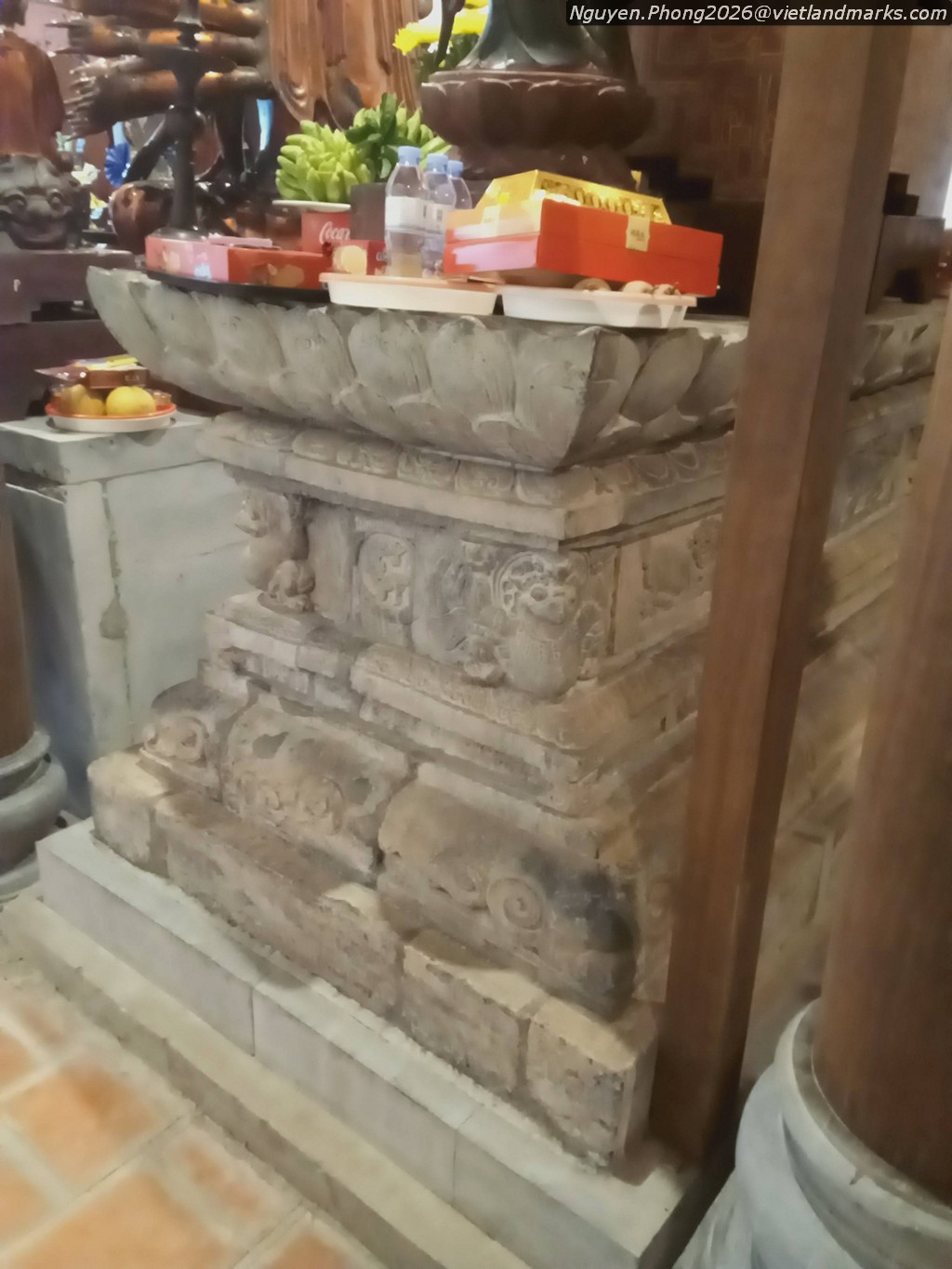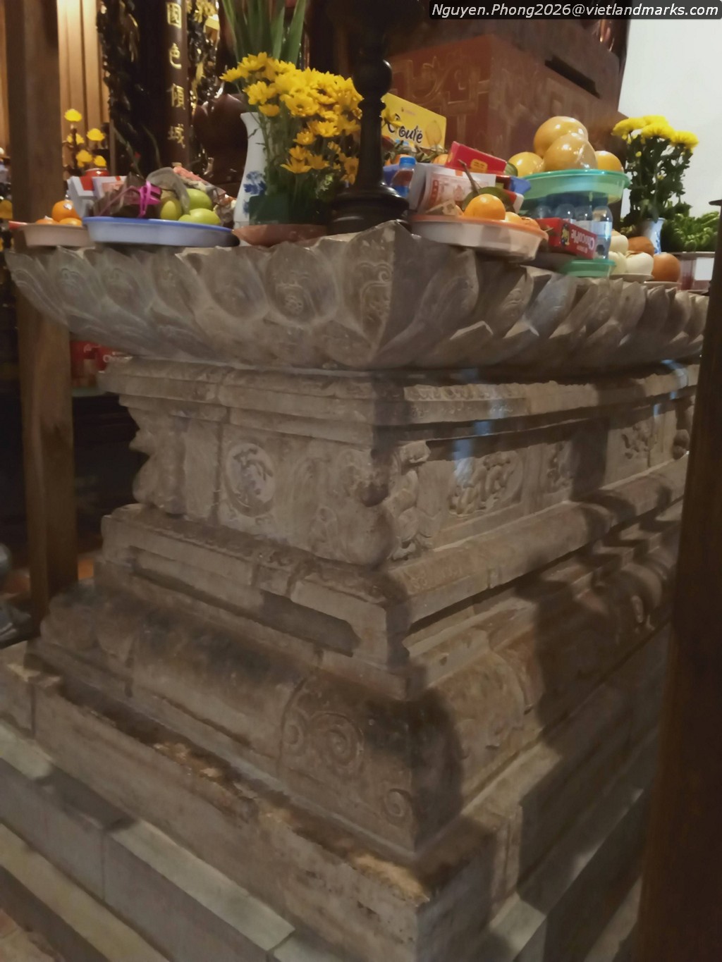 Ấn tượng nhất khi đến thăm chùa là bệ thờ bằng đá, tạc hình cánh sen, có khắc minh văn xác định thời gian tạo tác vào năm Long Khánh thứ 2 (1374), thời Trần. Bệ đá đã được công nhận là bảo vật quốc gia, lễ đón nhận quyết định được tổ chức trọng thể vào ngày 17/4/2026 cùng dịp với bệ đá chùa Hương Trai của làng Sấu - Dương Liễu cùng xã.