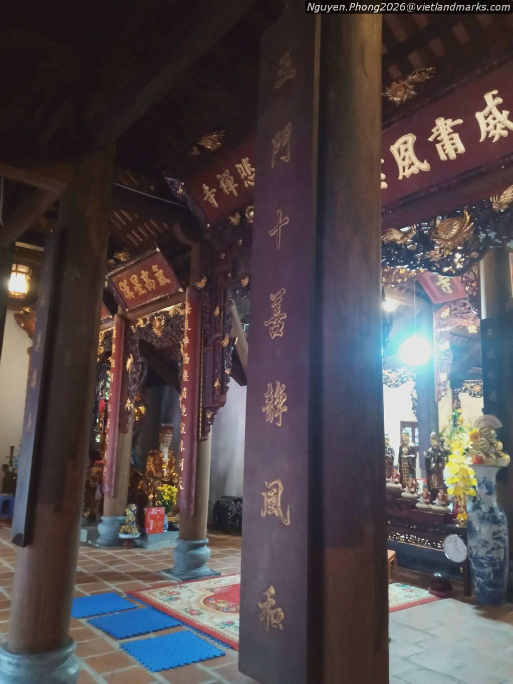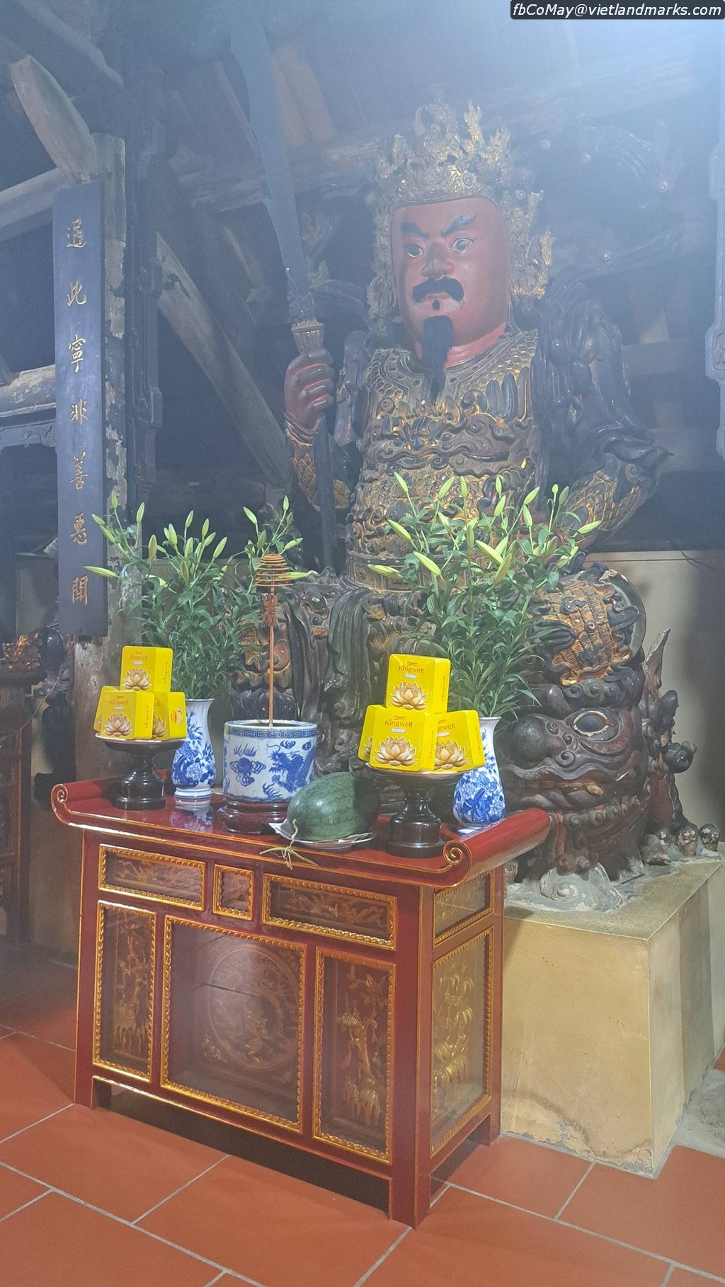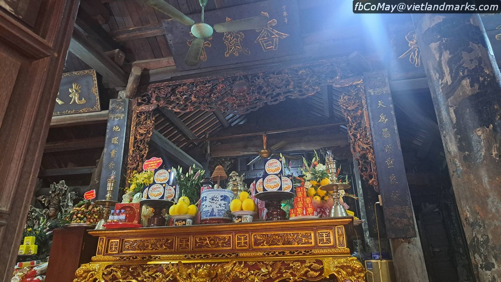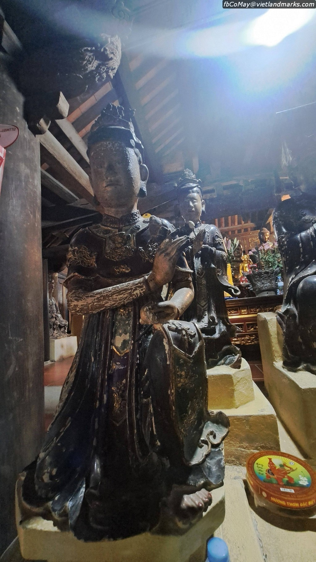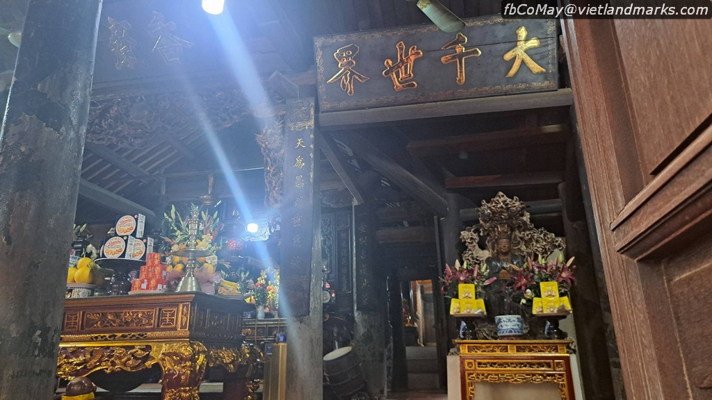 Tiền đường bài trí hệ thống tượng gồm Hộ pháp ngồi trên sư tử, Đức Ông và Thánh Hiền ngồi trên ngai, còn tượng Giám trai và Thổ địa đều là những pho được tạo tác đầu thế kỷ XX. Hồi bên trái có 2 tấm bia nhỏ, kê tên 20 vị đỗ đạt của địa phương.
