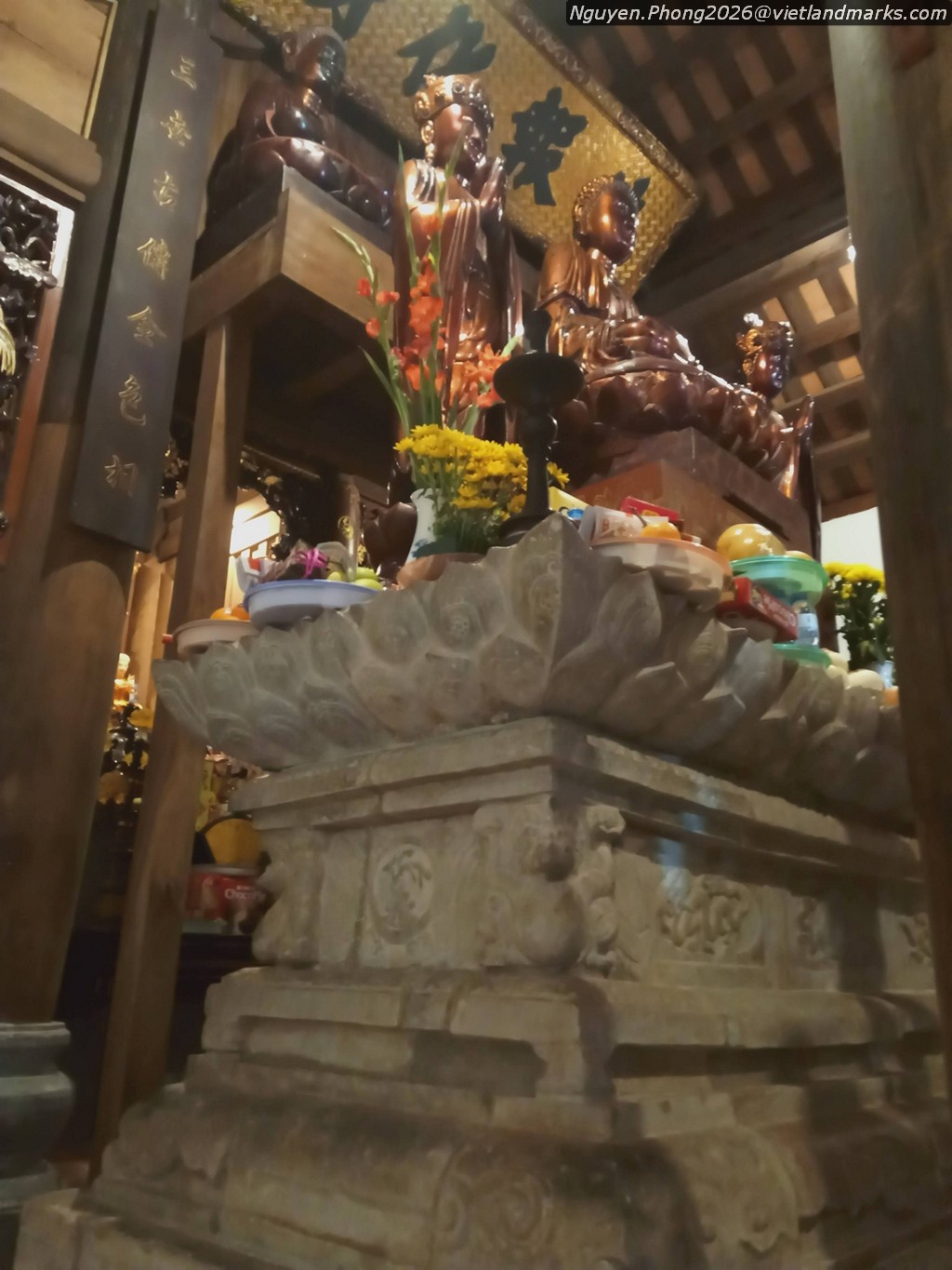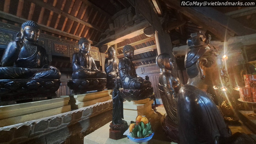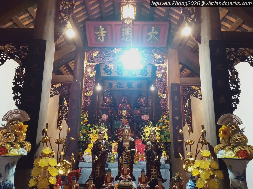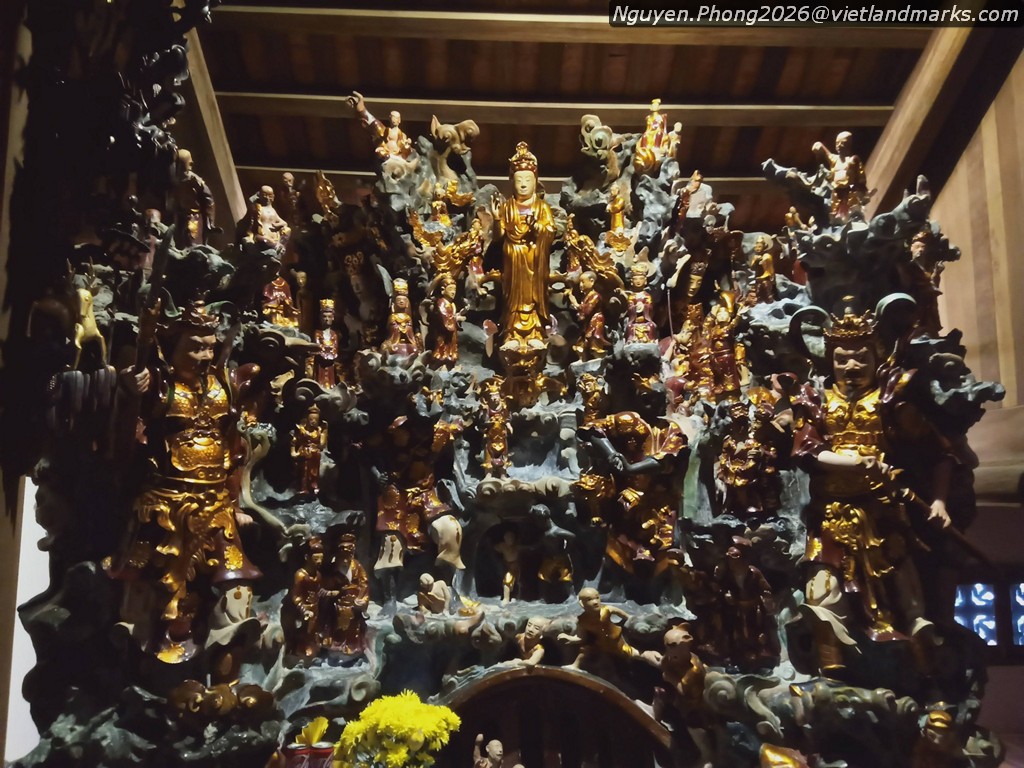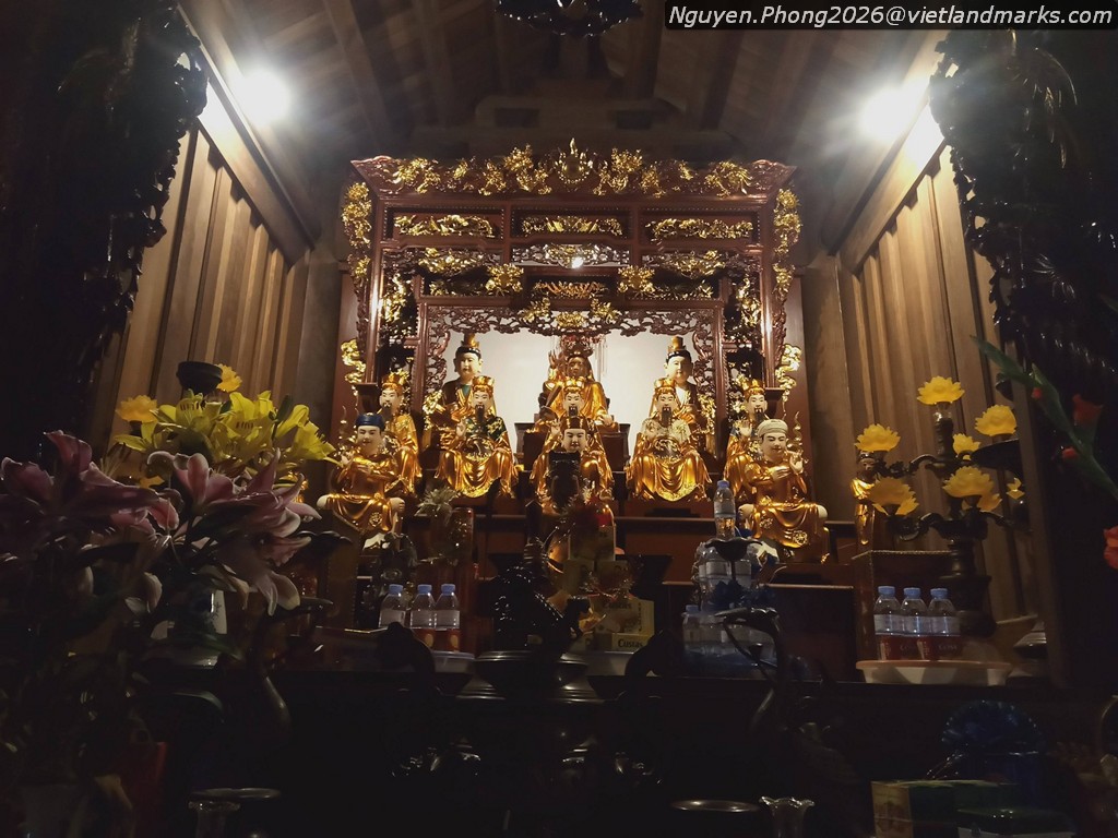 Hậu đường được xây cao hơn so với Tiền đường và Thiêu hương. Trên cùng là tượng Phật, thấp hơn là tượng đức Thánh Trần, tượng Mẫu, tượng cô, cậu, hai bên là hai động đắp bằng đất với vô số tượng mô tả thế giới theo quan niệm nhà Phật. Từ tội nhân bị tra tấn đến Thần Phật ở trên cao. Đây là hình ảnh sống động về nhân sinh quan của Phật giáo.