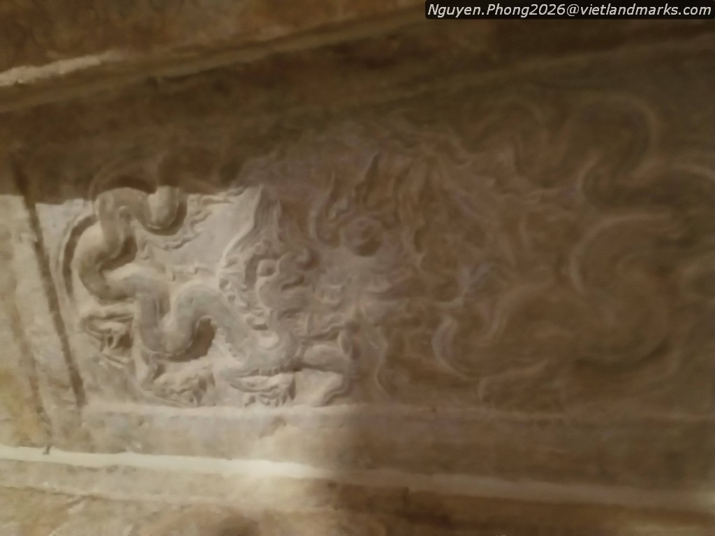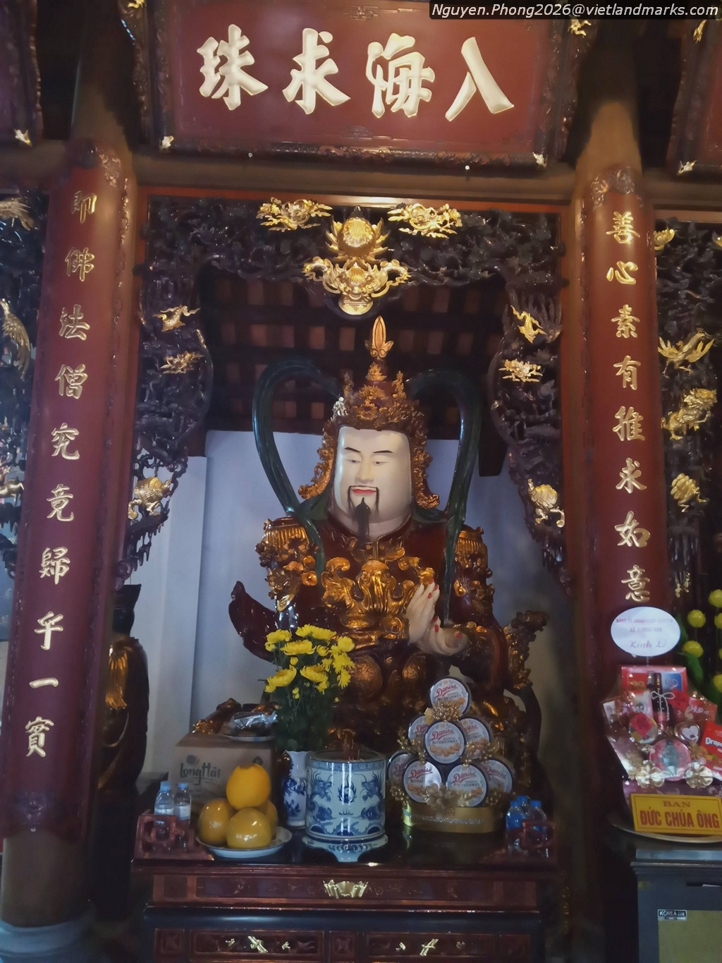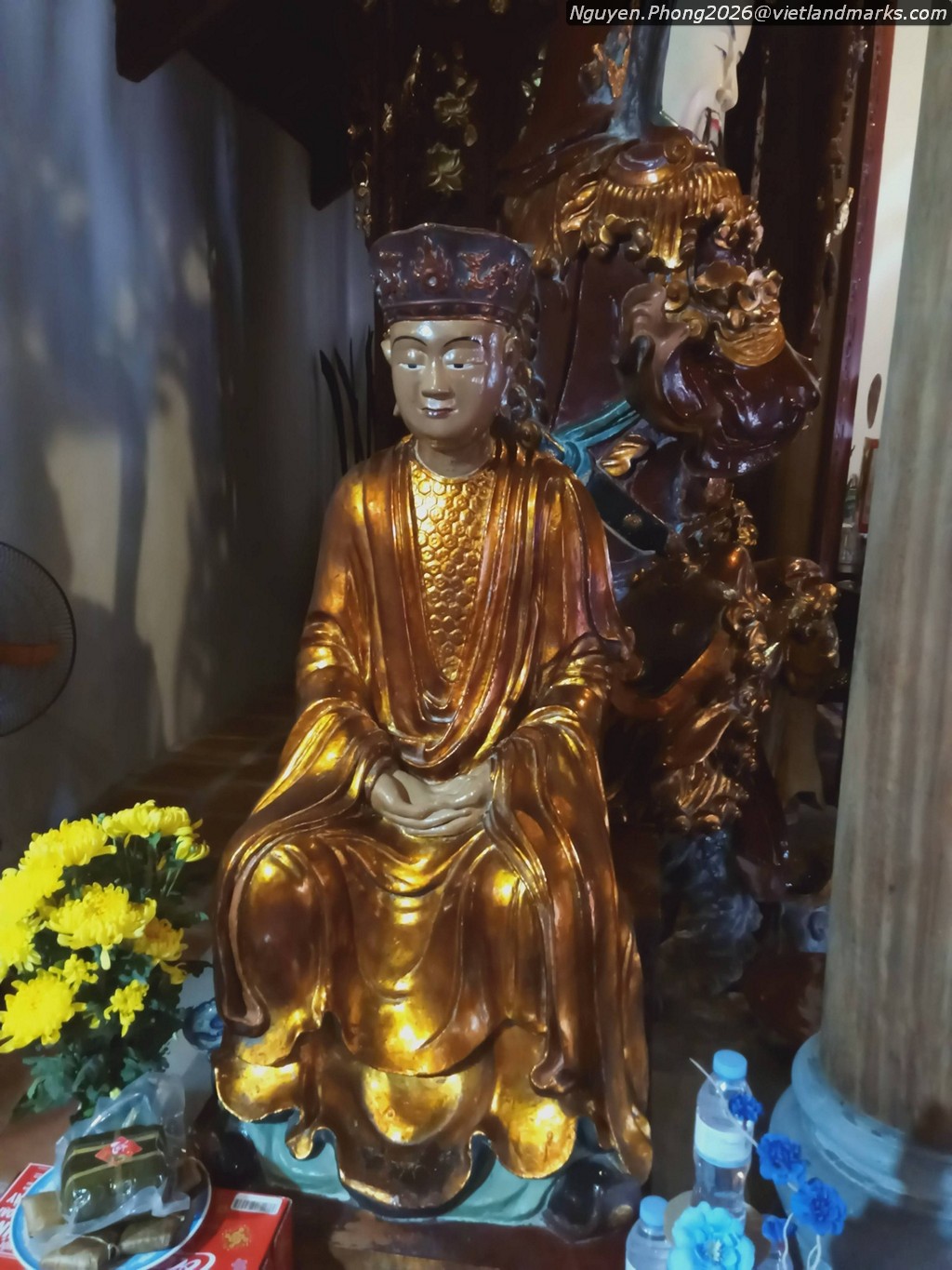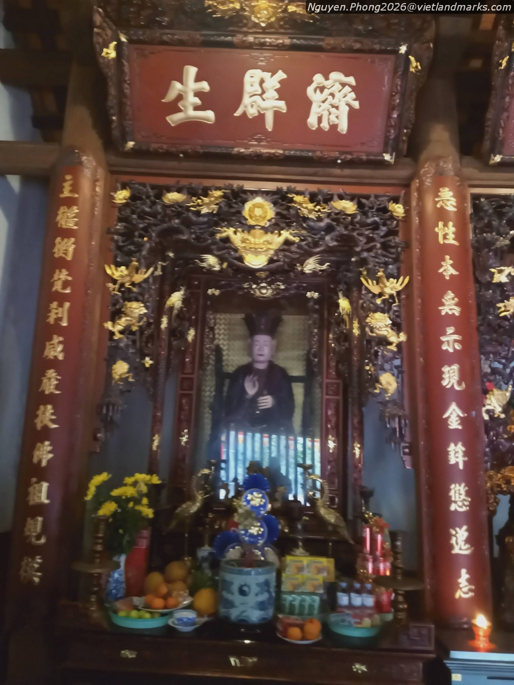 Hậu đường được xây cao hơn so với Tiền đường và Thiêu hương. Trên cùng là tượng Phật, thấp hơn là tượng đức Thánh Trần, tượng Mẫu, tượng cô, cậu, hai bên là hai động đắp bằng đất với vô số tượng mô tả thế giới theo quan niệm nhà Phật. Từ tội nhân bị tra tấn đến Thần Phật ở trên cao. Đây là hình ảnh sống động về nhân sinh quan của Phật giáo.