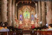 Sau khi ta đi qua các gian giáo dân ngồi, thì đến gian gần cuối, chính là trung tâm của viên ngọc quý, là gian Cung Thánh. Hãy nhìn những tòa sơn son thếp vàng lộng lẫy đây, thật là một sự kết hợp Đông Tây hoàn hảo. Tòa vàng của nhà thờ Hai Giáp dựa trên nền tảng bàn thờ Baroque, đó là chia nhiều ban để đặt nhiều tượng ảnh lên tòa thờ, cùng dùng những hoa văn và họa tiết trang trí để làm bàn thờ trở nên như một viễn cảnh Thiên đàng với Các Thánh chầu quanh Chúa Giêsu Kitô đang hiện diện trong Bí tích Thánh thể giữa cộng đoàn, song lại kết hợp với chạm khắc và thếp vàng truyền thống của người Việt ta từ mấy trăm năm, để cho ra ba tòa vàng tráng lệ đến mức chúng tôi có khi nghĩ rằng: đây là bàn thờ Công giáo đẹp nhất thế giới.