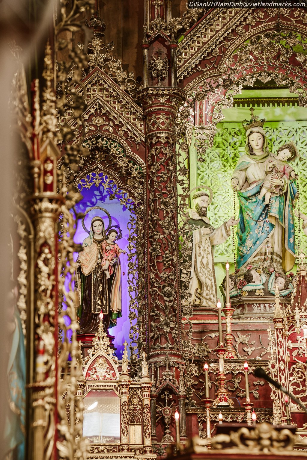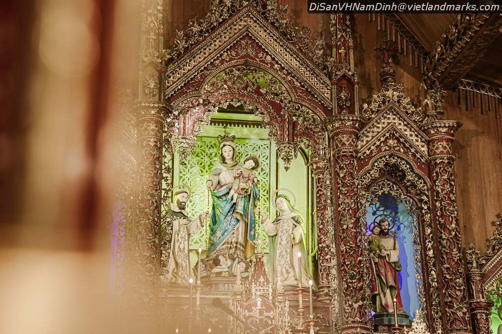 Vì nhà thờ Hai Giáp không cao so với các nhà thờ Tây Phương, nên tòa vàng được dàn theo hàng ngang thay vì hàng dọc theo chiều cao. Vì nhà thờ Hai Giáp có quan thầy là Đức Mẹ Mân Côi, nên ngay tòa chính có tượng Đức Mẹ Mân Côi trao tràng hạt cho Thánh Đaminh và Thánh Catarina vốn là hai cột trụ của Dòng Giảng Thuyết. Nếu nhìn từ dưới Cung Thánh lên, ta sẽ thấy bên tả là Tòa Bà Thánh Philumena quan thầy phái nữ, và bên hữu là Ông Thánh Vincentê quan thầy phái nam. Là một giáo dân địa phận Trung, nay là địa phận Bùi Chu, ắt hẳn bạn sẽ biết tại sao ngày xưa người ta hay chuộng kính hai đấng ấy cách riêng chăng? Bởi lẽ ông Thánh Vincentê là người thuộc dòng Giảng Thuyết, được cho là đấng hay làm phép lạ, và nhiều giáo dân cũng được ơn ngài cách riêng, nên các đấng dòng ấy khi sang đây thì đã rao giảng lòng kính mến ông Thánh Vincentê, cũng giống như các địa phận thuộc Hội Thừa Sai Paris dạy giáo dân năng kính ông Thánh Antôn vậy. Còn về bà Thánh Philumena, thì xưa kia, khi chưa tách địa phận mà hãy còn thuộc về địa phận Đông, Đức Cha Thánh Liêm đã năng khấn Bà Thánh Philumena giữ gìn bổn đạo, cùng cầu xin cho người lương được trở lại, và Đức Cha đã nhận được ý ngài xin, nên ngài đã chọn Bà Thánh Philumena làm quan thầy địa phận Đông.