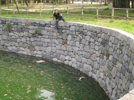 Mặt trước ngoài hoàng thành khoảng 100m còn lại dấu vết của cổng vào rộng trên 6m, hai bên có xây 2 bức tường thành hình cánh cung kéo dài đến sát bờ sông Ngọc, móng tường thành còn lại dầy 1,08m, qua cổng thành khoảng 10m đến một con sông đào có tên là sông Ngọc. Sông này bắt nguồn từ Tây Hồ, chạy vòng qua trước thành và điện Lam Kinh.