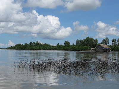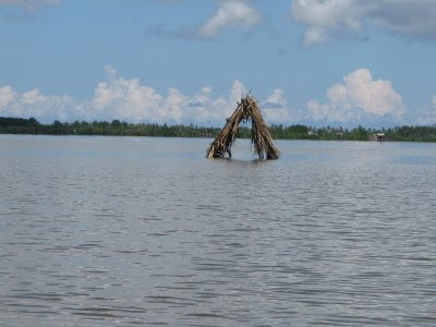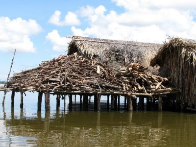 Dưới đây là cái ảnh người ta phơi củi trên nóc... chòi. Hai mái lá chụm lại giữa sóng nước là để cho người làm nghề hạ bạc bơi xuồng chui vô đó ngủ. Trời ơi, đời tui chỉ cần ngủ kiểu vậy một lần, một lần thôi cũng được...