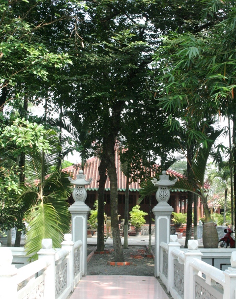 ngôi chùa cổ thấp thoáng sau hàng cây như nhỏ bé hẳn lại |
