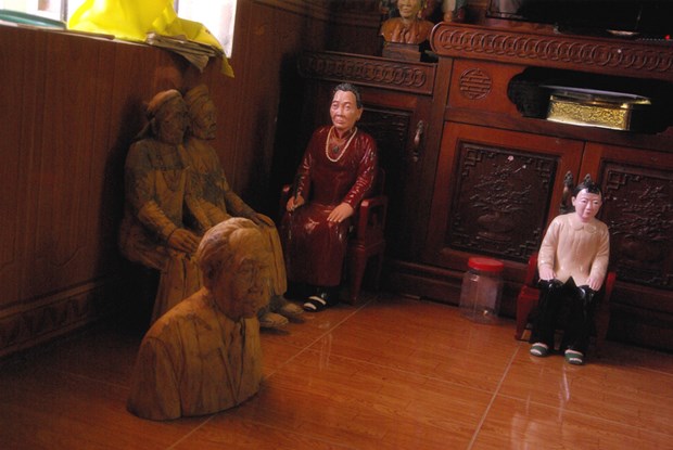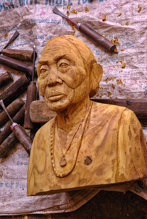 Tôi theo chân nhóm Đình làng Việt đi điền dã đến các di tích đình, đền và chùa cổ trên đất Hải Phòng và có cơ hội ghé thăm làng mộc thôn Bảo Hà nổi tiếng của thành phố hoa phượng đỏ. Tượng Linh Lang đại vương (giữa) và hệ thống tượng trong miếu Bảo Hà. Chúng tôi đến miếu Bảo Hà (hay miếu Cả) nằm trên địa phận ba thôn Bảo Động, Hà Cầu và Mai An của xã Đồng Minh, huyện Vĩnh Bảo, nơi lưu giữ nhiều bức tượng gỗ quý hiếm với phong cách tạc tượng độc đáo của nghệ nhân Vĩnh Bảo. Đặc biệt trong miếu có thờ tượng Linh Lang đại vương, được dân quanh vùng coi là báu vật. Bức tượng được tạc với tư thế ngồi trên ngai, tay cầm văn tự có thể chuyển động, có thể đứng lên một cách nhẹ nhàng rồi lại từ từ ngồi xuống. Sự chuyển động của bức tượng nằm ở cánh cửa ngay điện thờ, khi mở dần cánh của thì bức tượng từ từ đứng lên nhưng khi khép lại thì bức tượng lại ngồi xuống và trở lại tư thế ban đầu. Bức tượng này đã làm cho không ít người tới đây ngạc nhiên, qua đó cho thấy được sự tài hoa, khéo léo trong việc tạc tượng của người dân Bảo Hà khi kết hợp hài hòa giữa nghệ thuật tạc tượng và nghệ thuật múa rối. Được biết, ngoài tượng Linh Lang đại vương, các bức tượng khác trong miếu Bảo Hà hay nhiều hệ thống tượng gỗ trong các đình, chùa, miếu mạo trên đất Hải Phòng như chùa Mét (Tiêu Hương tự), chùa Miễu, chùa Hàng Kênh... đều do các nghệ nhân tạc tượng dân gian thuộc làng Bảo Hà xưa làm nên. Được biết, làng tạc tượng Bảo Hà là làng nghề điêu khắc, sơn mài truyền thống đã tồn tại trên 500 năm và có hơn nửa thiên niên kỷ chuyên tạc tượng Phật, được coi là cái nôi của nghề tạc tượng Việt Nam. Năm 2007, làng tạc tượng Bảo Hà được công nhận là làng nghề truyền thống. Trong làng hiện nay còn xuất hiện một loại hình tạc tượng độc đáo khác là tạc tượng truyền thần. Nếu như vẽ truyền thần trong hội họa cho ra những bức tranh vẽ như ảnh chụp thì tạc tượng truyền thần là các sản phẩm tượng 3D được điêu khắc hết sức tinh xảo và giống người thực. Ông Bưởng vui vẻ giới thiệu về tạc tượng truyền thần tại xưởng tạc đơn sơ của mình. Ông Đỗ Văn Bưởng (66 tuổi) là nghệ nhân tạc tượng truyền thần có thâm niên ở thôn Bảo Hà, xã Đồng Minh. Ông Bưởng có thể dựa vào bức ảnh chân dung hoặc toàn thân của khách hàng, từ đó tạc nên bức tượng chất liệu gỗ giống gần như đúc so với bức ảnh. Kinh nghiệm từ nhỏ và là truyền nhân đời thứ ba trong gia đình có nghề tạc tượng, được cha truyền cho các kỹ thuật điêu khắc tượng giúp ông Bưởng tự tin tạo ra những bức tượng truyền thần độc nhất vô nhị. Tượng được tạc theo bức ảnh chụp sẵn. Cận cảnh một bức tượng được tạc theo phương pháp truyền thần của ông Bưởng Theo chia sẻ của ông Bưởng, ông bắt đầu theo đuổi nghề tạc tượng truyền thần từ cách đây 30 năm vì đam mê và sở thích sau khi nghỉ làm tại xưởng tập thể. Bức tượng truyền thần đầu tiên ông làm là tượng bà ngoại của ông Bưởng, được ông làm dựa theo bức ảnh cũ nát còn lại của bà cụ. Bức tượng hoàn thành khiến các thành viên trong gia đình ai nấy đều giật mình vì tượng quá giống so với ảnh. Từ đó về sau người dân trong vùng tìm đến nhờ ông tạc tượng truyền thần người thân đã mất để thờ cúng. Như vậy nghề tạc tượng truyền thần chính thức gắn bó với ông Bưởng và trở thành nghề mưu sinh chính của gia đình ông trong khu xưởng tạm bợ tại gia với diện tích khiêm tốn chưa đầy chục mét. Những bức tượng cỡ vừa như thế này có giá từ 3 – 4 triệu đồng. Mỗi bức tượng truyền thần cao từ 30 - 60cm có giá từ 3 - 4 triệu đồng với thời gian hoàn thành từ 5 – 7 ngày. Với một bức tượng có kích thước như người thật thời gian sẽ lâu hơn đến cả tháng trời với giá từ 15- 20 triệu đồng. Nguyên liệu chính được ông Bưởng sử dụng là gỗ mít vì chất gỗ rắn, dai, toàn lõi và không lo mối mọt qua thời gian. Hơn nữa gỗ mít cũng dễ đục nhất trong quá trình tạo tác. Các bức tượng được ông Bưởng tạo khối ban đầu như các bộ phận cơ thể rồi đến đường nét và cân bằng bố cục. Phần gương mặt thường được làm sau và là công đoạn khó nhất bởi thần thái của người trong ảnh có được phản ánh đầy đủ trên bức tượng hay không chủ yếu ở công đoạn này. Phần tạc gương mặt là công đoạn khó nhất. Ngoài ra theo ông Bưởng, nét mặt nổi bật được tính cách của người được truyền thần còn phụ thuộc rất nhiều vào khâu sơn, vẽ. Nếu sơn quá đậm sẽ che mất những nét mặt đã được chạm khắc tỉ mỉ trước đó, sơn nhạt thì bức tượng bị thô không có hồn. Bước tiếp theo là dùng đèn khò làm cháy hết những dăm gỗ nhỏ, dùng giấy ráp chà nhẵn bề mặt nhưng không l