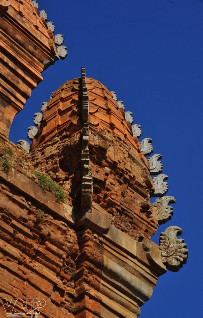 < Những đường nét trang trí mang đậm nét kiến trúc Chămpa trên đỉnh tháp Bánh Ít.